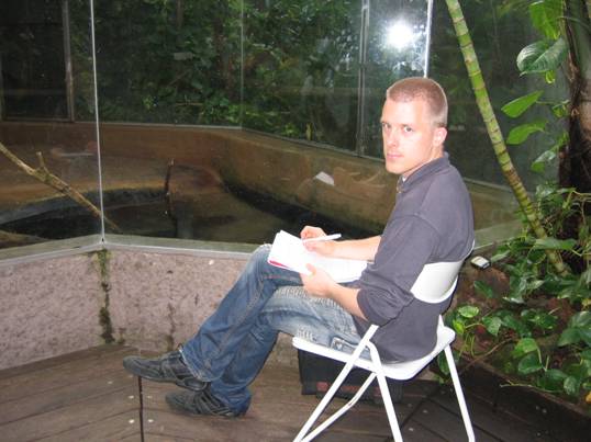 Ich beim beobachten der Kurzkrallenotter im Aquazoo. Foto: Dr. Wolfgang W. Gettmann.
