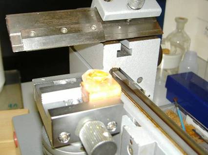 Mit dieser Apperatur schnitt ich die in Paraplast eingebetteten Hoden von Molchen.