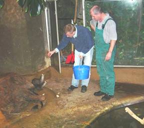 Bei der Fütterung der Kurzkrallenotter im Aquazoo Düsseldorf mit C. Nissen.