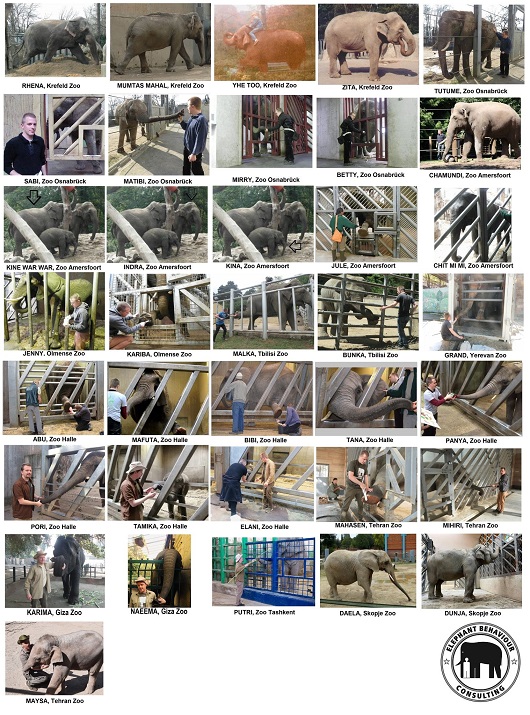 Diplom-Biologe Tobias Dornbusch hat bisher (Mitte 2022) mit 36 Elefanten in 11 Zoos gearbeitet (in Europa, Afrika und Asien). Zudem noch mit weiteren Elefanten in asiatischen Arbeitscamps und Tempeln.