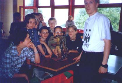 Artenschutz-Unterricht in einer Schule, mit Kaiman, ca. 2002. Foto: Tobias Dornbusch-Archiv.