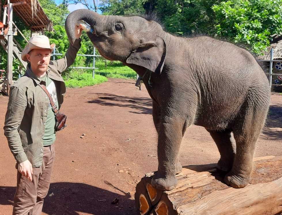 In einem Elefantencamp im Kambodscha unterstützte ich den schwedischen Elefantenpfleger Dan Koehl bei der Aufzucht des Elefantenbabies "Noelle", 2023. Foto: Tobias Dornbusch-Archiv.