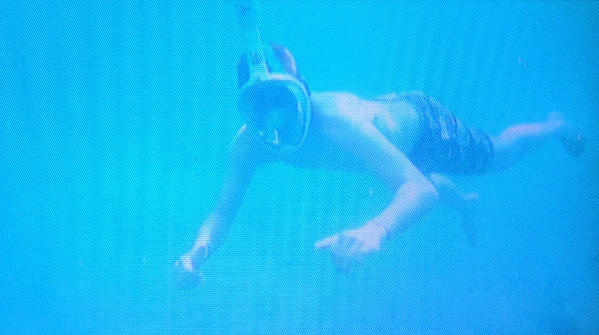 Ein Delfin im Ozean hat eine Plastiktüte an der Schwanzflosse, 2008. Foto: Tobias Dornbusch.