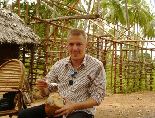 Ich beim essen einer Kokosnuss in einem Giriama-Dorf in Kenia, 2005.