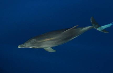 Ein Delfin im Ozean hat eine Plastiktüte an der Schwanzflosse, 2008. Foto: Tobias Dornbusch.