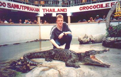 Hier streichel in ein Krokodil in einer Farm in Thailnd, 2001. Foto: Tobias Dornbusc-Archiv.