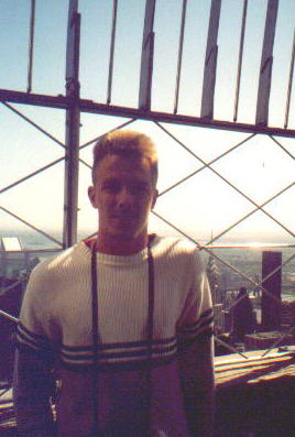Ich auf dem Empire State Building in New York mit Bilck auf das Chrysler Building im Jahr 2003.