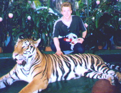 Ein armer Tiger in einer Farm in Thailand wird von mir gestreichelt (2001). Foto: Tobias Dornbusch-Archiv.